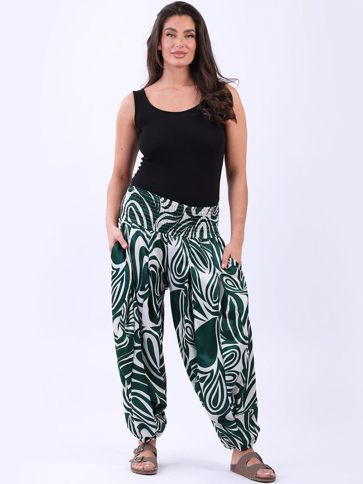 To fulfill the high end demands and unleash the wild side of women wearers with comfort and support The Lino Lounge online store USA designed this abstract print harem trouser. The combination of breathable soft fabric with classy yet essential features like a modish smocked style wide waist, flared style wide legs balloon hem and functional side pockets make this made in Italy trouser a perfectly redefined wardrobe must-have. The bold and bright colors go well with many styles from sequin tops to plain cardigans.