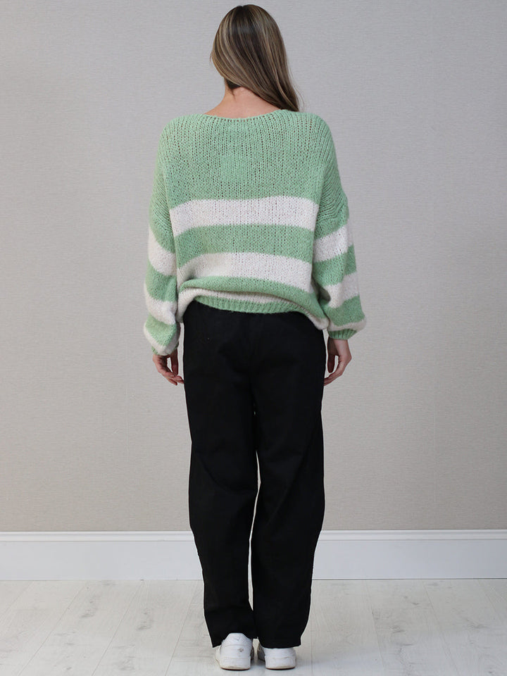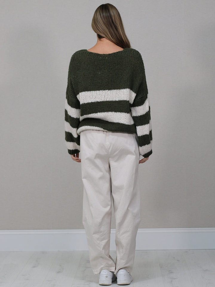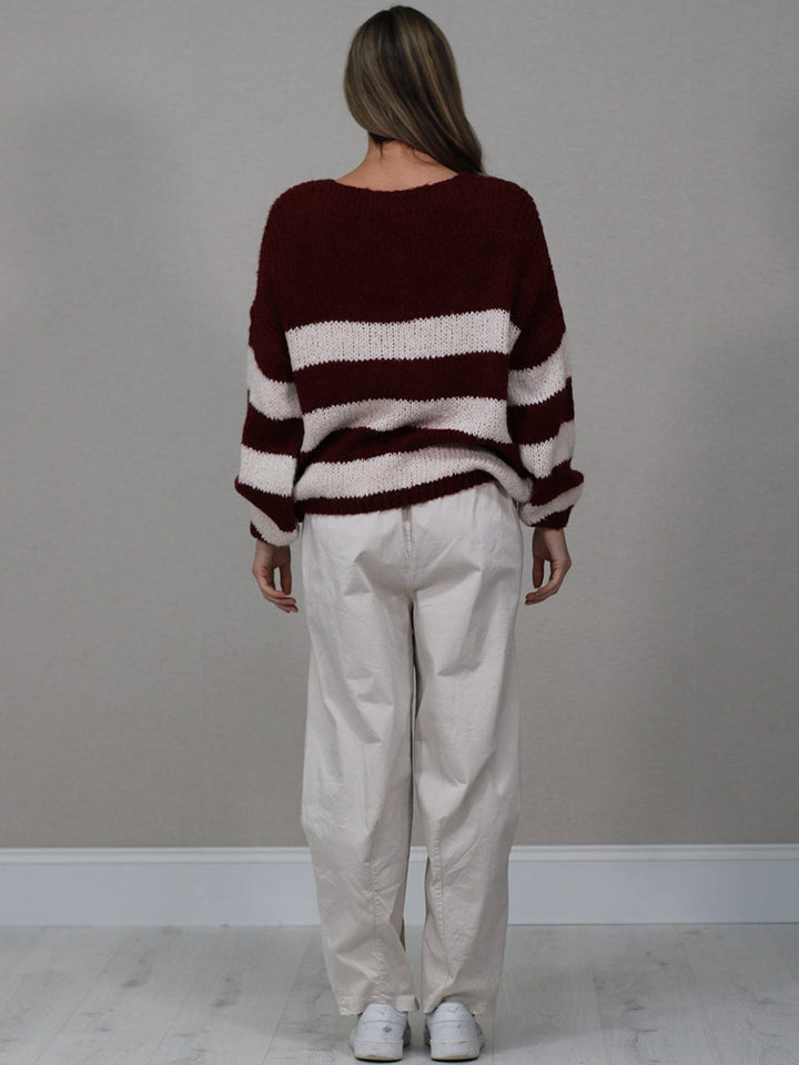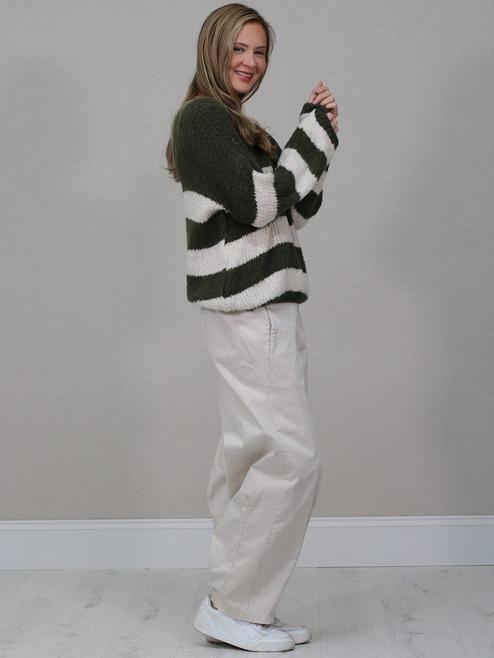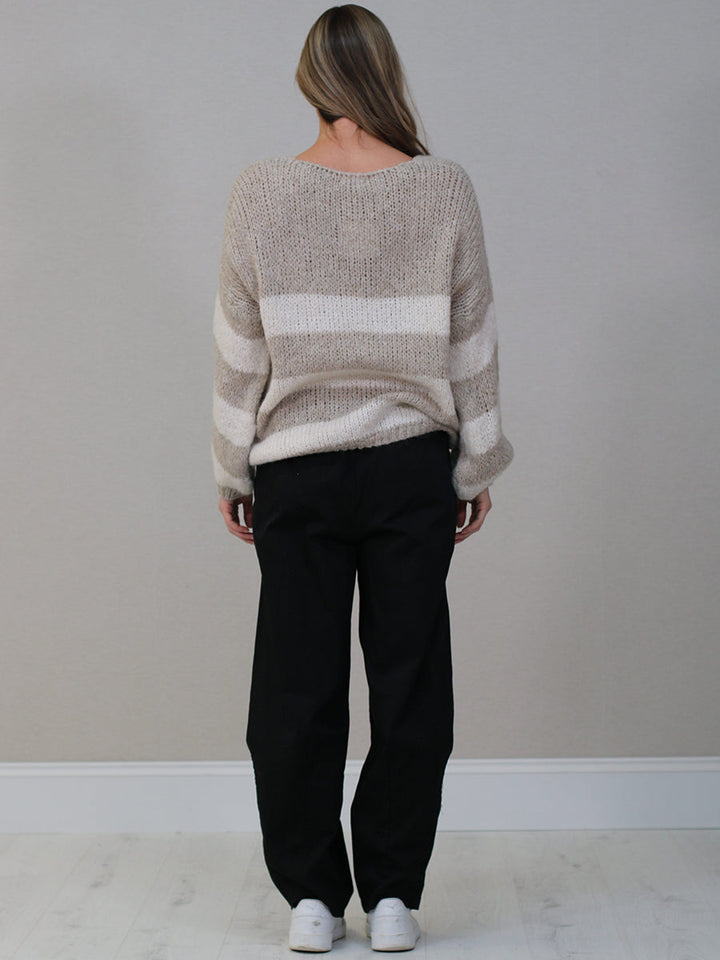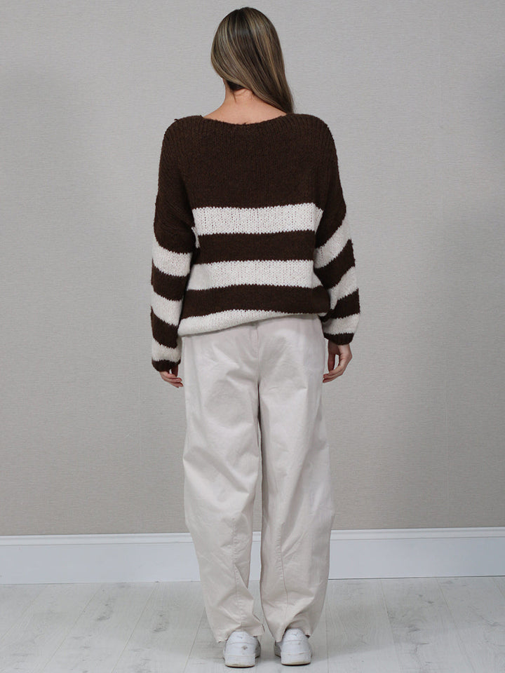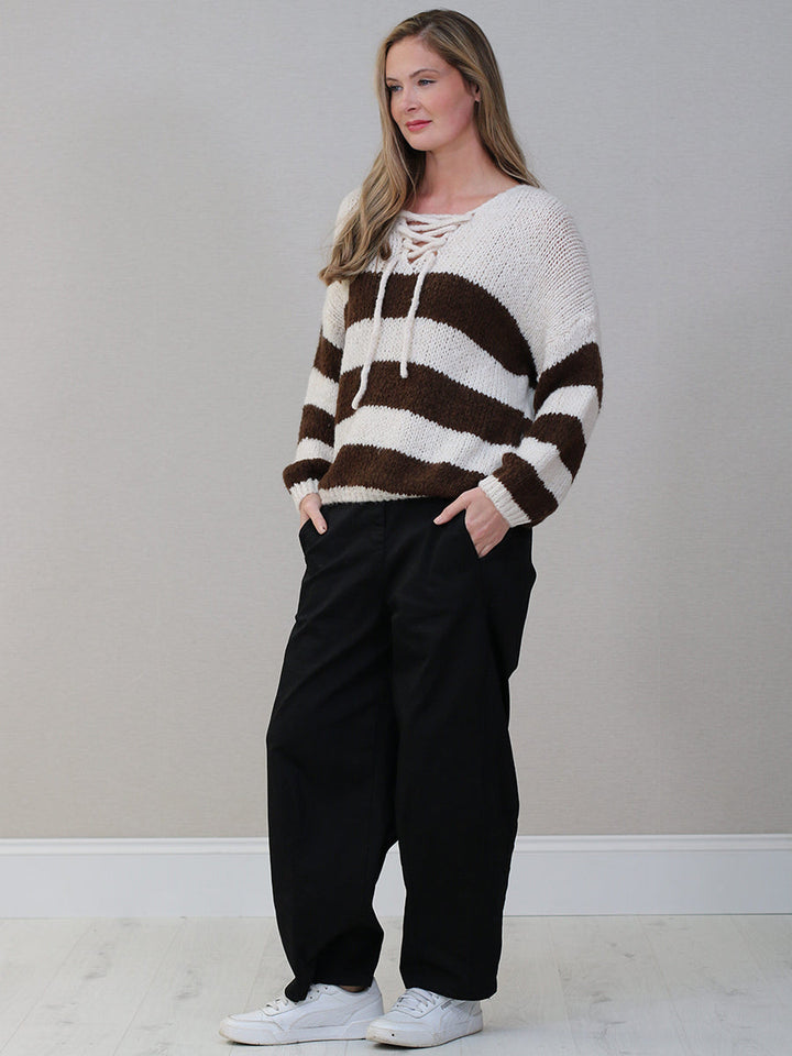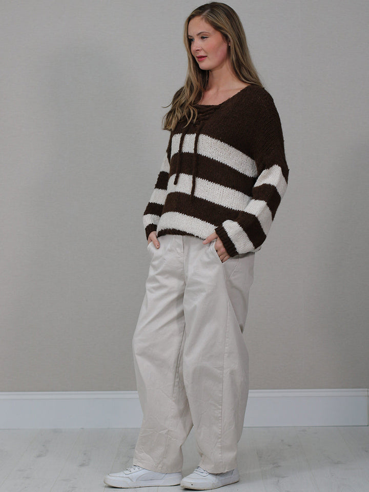 This Italian striped jumper brings warmth without the bulk. Made from quality wool that actually lasts, it features dropped shoulders that flatter and navy stripes that work with everything. The open-knit texture keeps it interesting while the drawstring neckline adds a relaxed vibe. Throw it on with jeans or layer over basics - it just works. Get yours at The Lino Lounge.