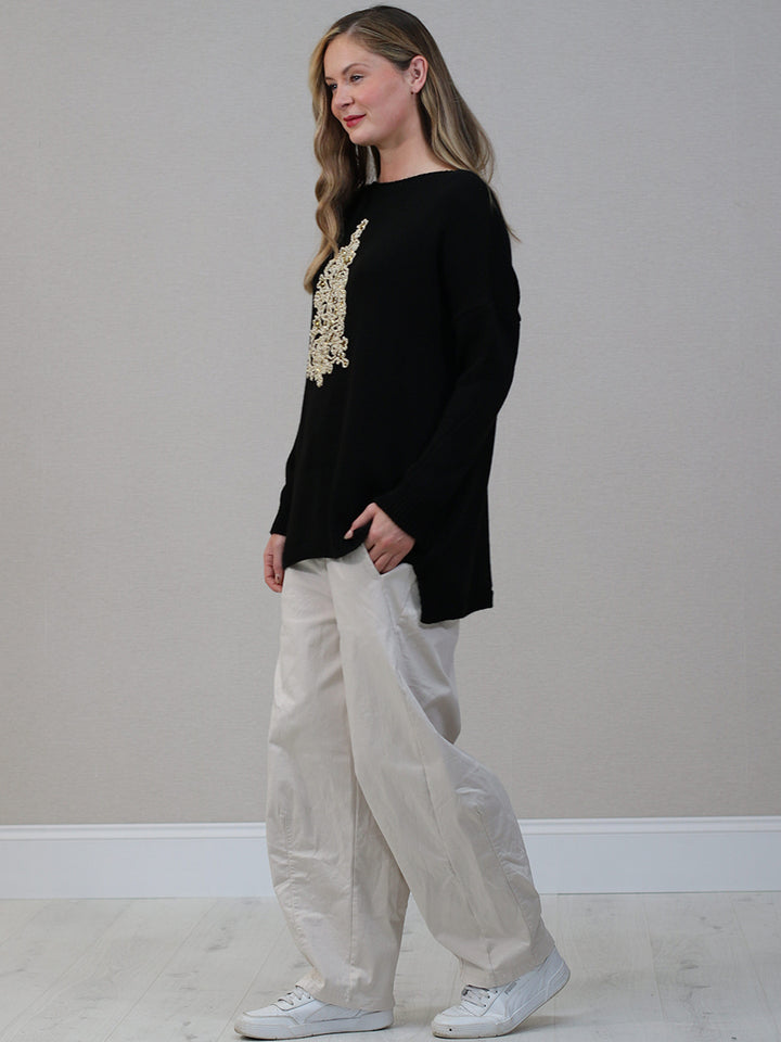 Prepare to dazzle this festive season with this beautiful crochet knitted jumper from Italy! The beautiful golden Christmas tree design brings such a lovely elegance, making it just right for those cherished family photos or festive dinners together. The gentle shimmer brings just the right touch of sparkle, making you feel warm and stylish throughout the season. It's just so cosy and lovely, perfect for sharing that holiday cheer!
