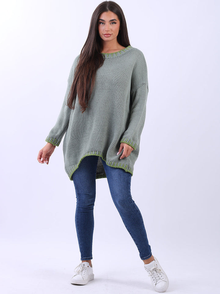 Indulge in the timeless allure of Italian fashion with this chunky wool knit jumper, crafted by The Lino Lounge online clothing store USA, to evoke the classic Italian Moda designs. The baggy, relaxed fit exudes an effortless elegance that's synonymous with how classic Italian women complete their look. This fine knit jumper is adorned with exquisite blanket stitch detailing on the neckline and hem, adding a touch of artisanal craftsmanship to its design. The wide round neckline offers a hint of understated charm. Whether women wearers choose to layer it over their summer ensembles for extra warmth or incorporate it into their seasonal wardrobe, this made in Italy wooly jumper is the epitome of style and comfort, capturing the essence of Italian sophistication.