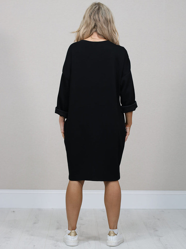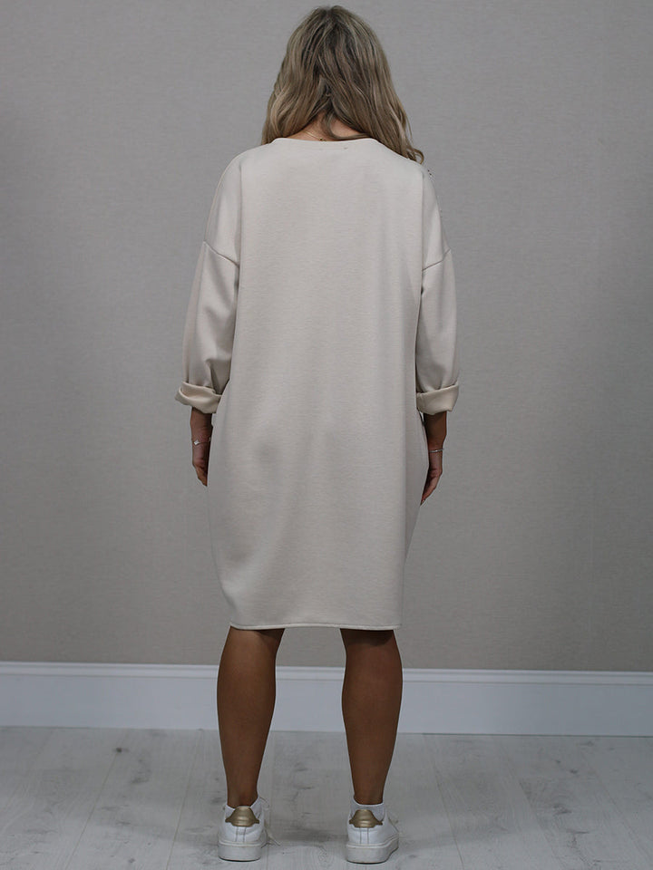 A perfect wardrobe essential for women wearers who appreciate effortless seasonal style this made in Italy dress features soft long sleeves that can be rolled up, a smooth round neckline, and shimmering sequin accents that add a subtle festive shine. Its clean, solid design makes it easy to mix and match. For a stylish boho-inspired outfit, pair it with fitted jeans and tall boots.