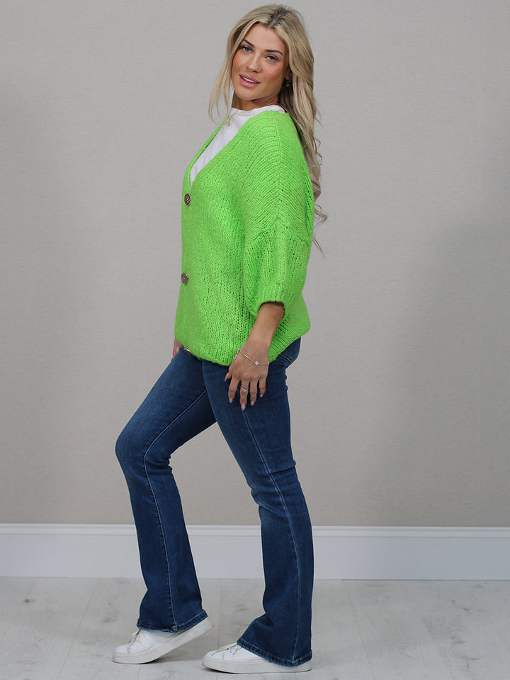 Chic and cozy, this made in Italy latest knitwear collection from The Lino Lounge women's store is what women want to wear on chilly nights of winter. This woolen knit cardigan is enriched with luxurious features like bold V neck, front buttons enclosure, and drop shoulders. Layer up this solid knitted cardigan in multiple ways to give an impressive look.