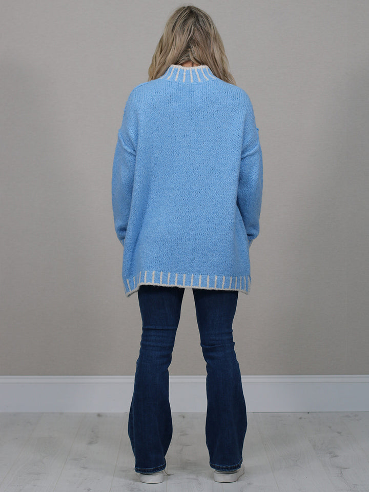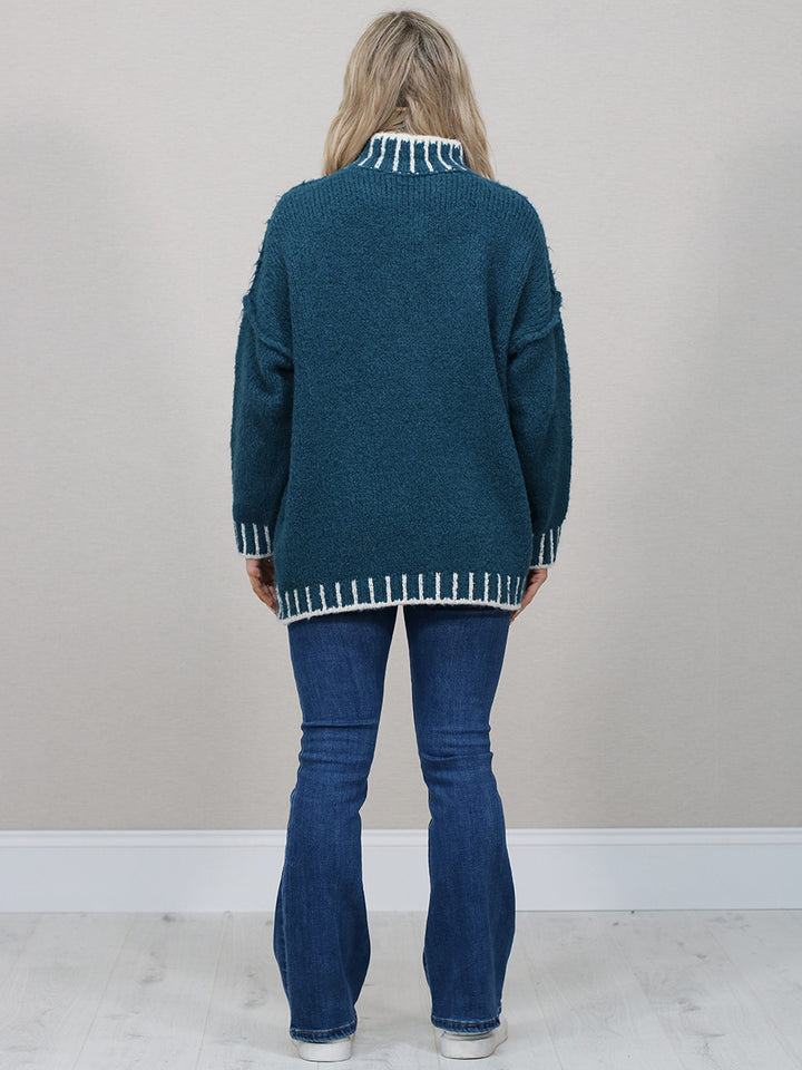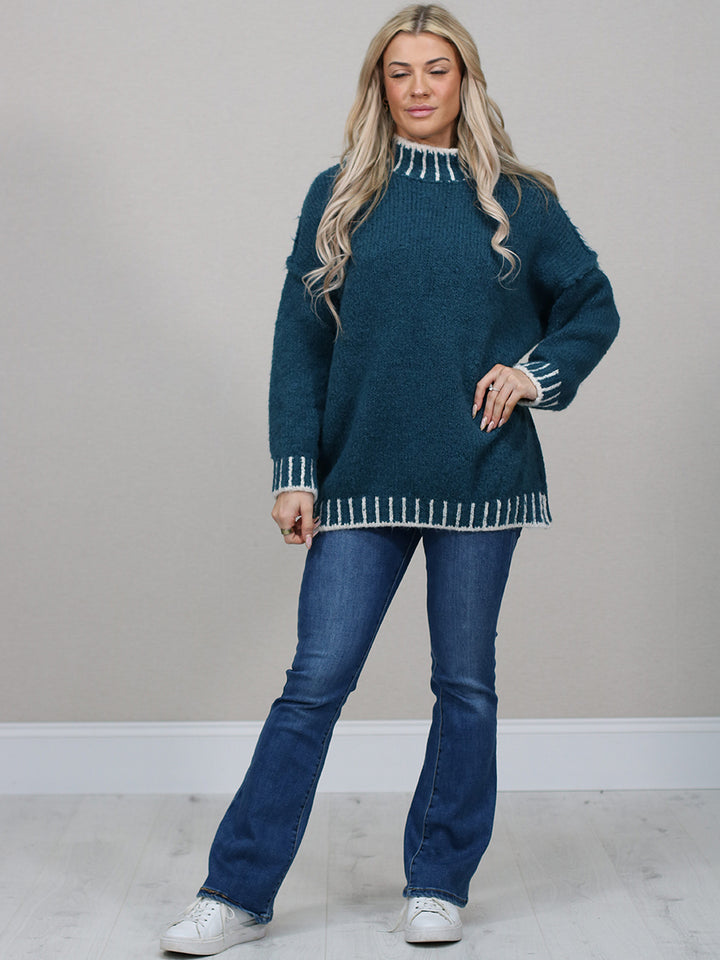 This ladies' wool jumper, with its lovely blanket stitches, will help you to wrap yourself in Italian-inspired comfort. Its long sleeves and baggy fit with a funnel neck make it a winter buddy. For a modern look, style it with skinny jeans and boots; for timeless appeal, go for wide-leg trousers and loafers.