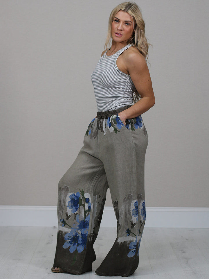 This made in Italy trouser brings easy style to women wearers everyday wardrobe. Designed in a soft linen fabric with a relaxed wide-leg fit, this wide leg trouser features an elastic waist and handy side pockets for all-day comfort. The classic floral print adds a touch of charm, making it perfect to pair with a basic crop top or a matching jacket for a clean, effortless look. Now available at The Lino Lounge Fashion Boutique USA.